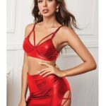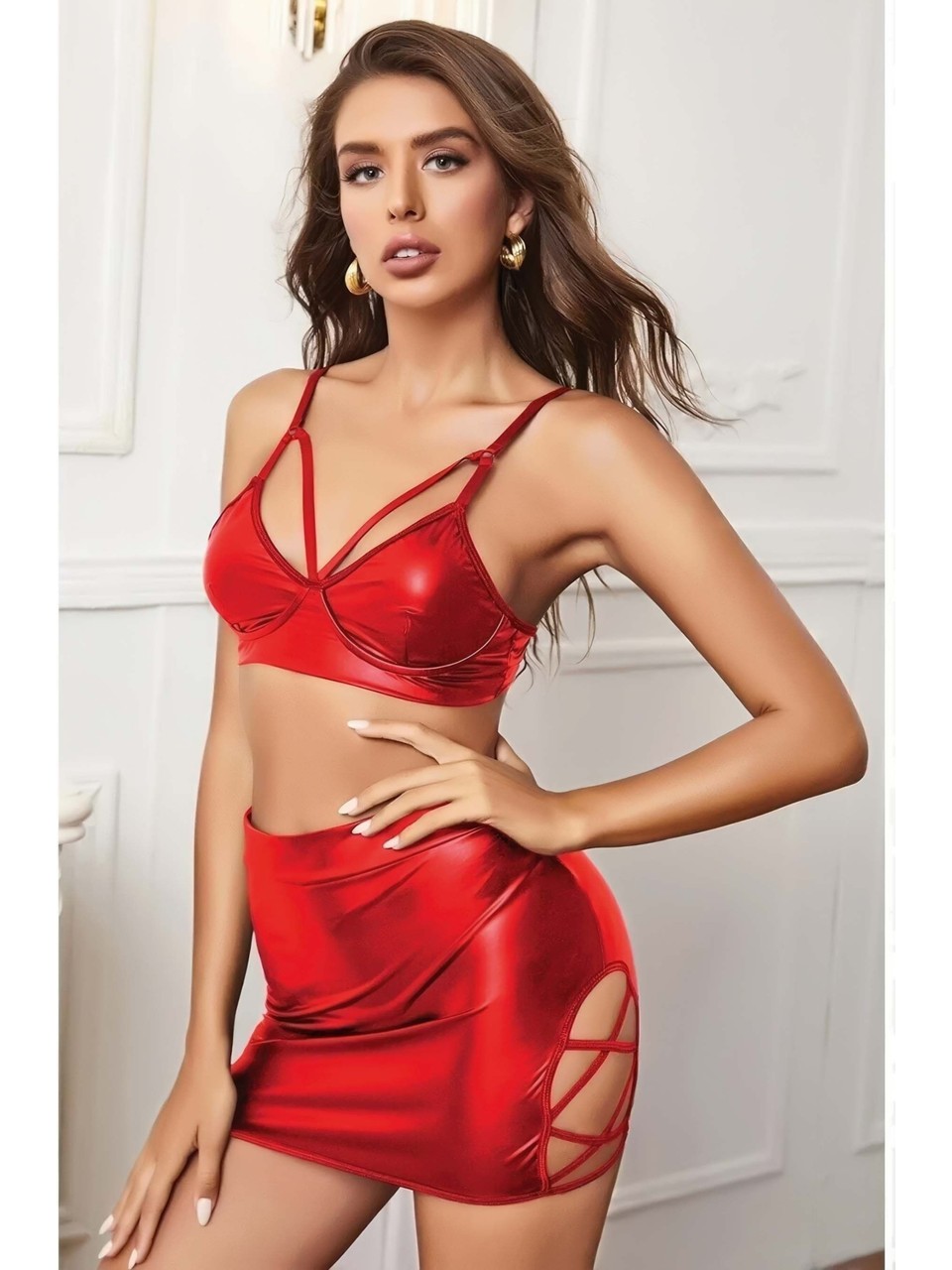 Parlak Görünümlü 2’li Takım Crop Top ve Mini Etek