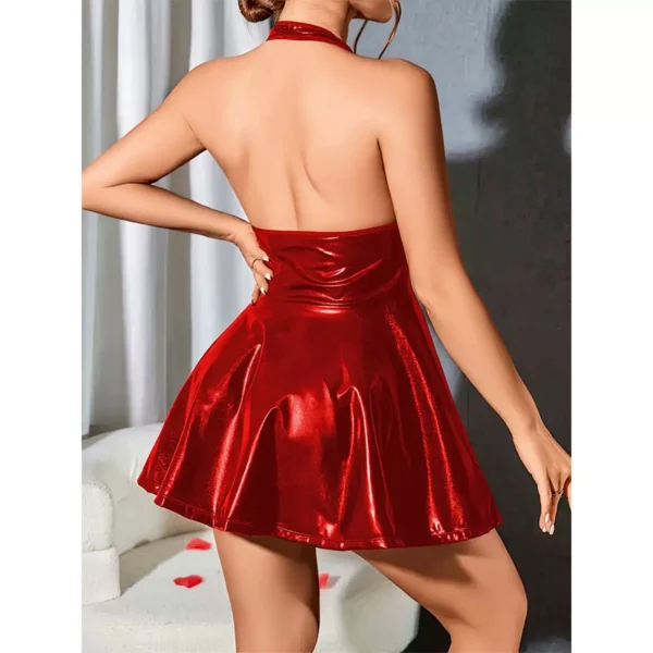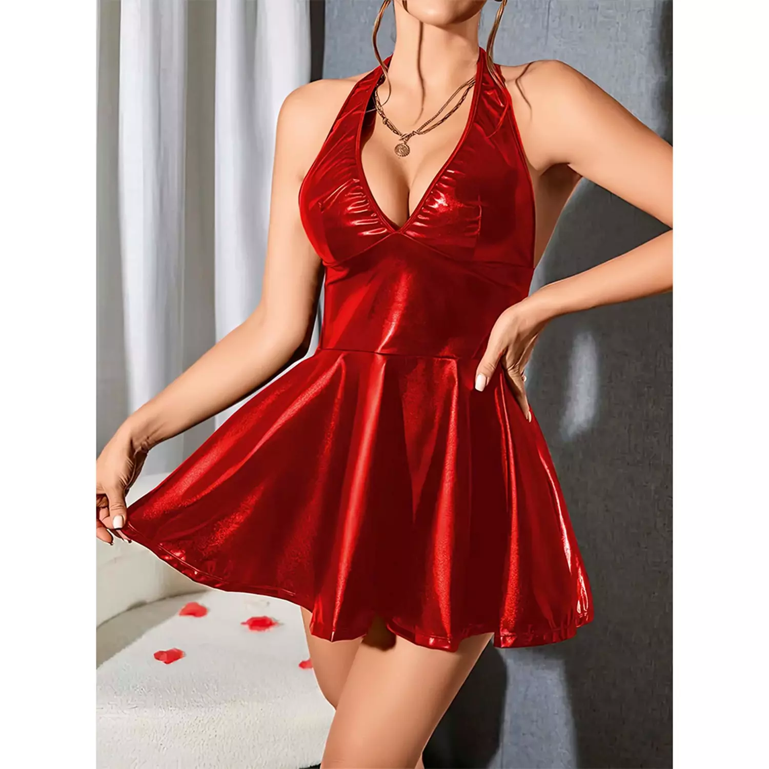 Parlak Islak Görünümlü Kırmızı Fantazi Mini Elbise