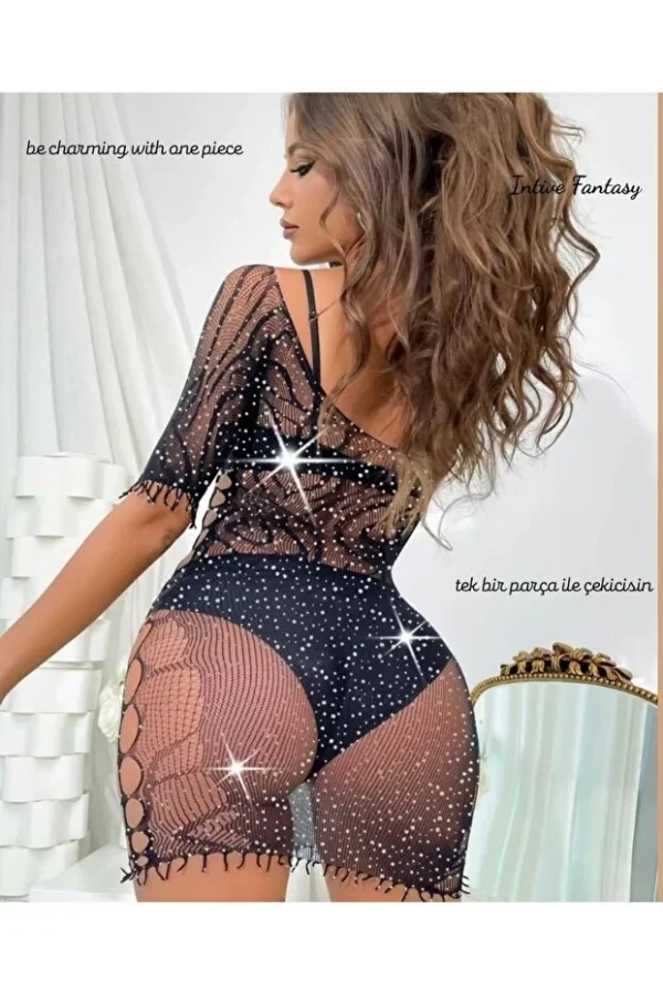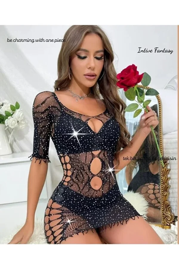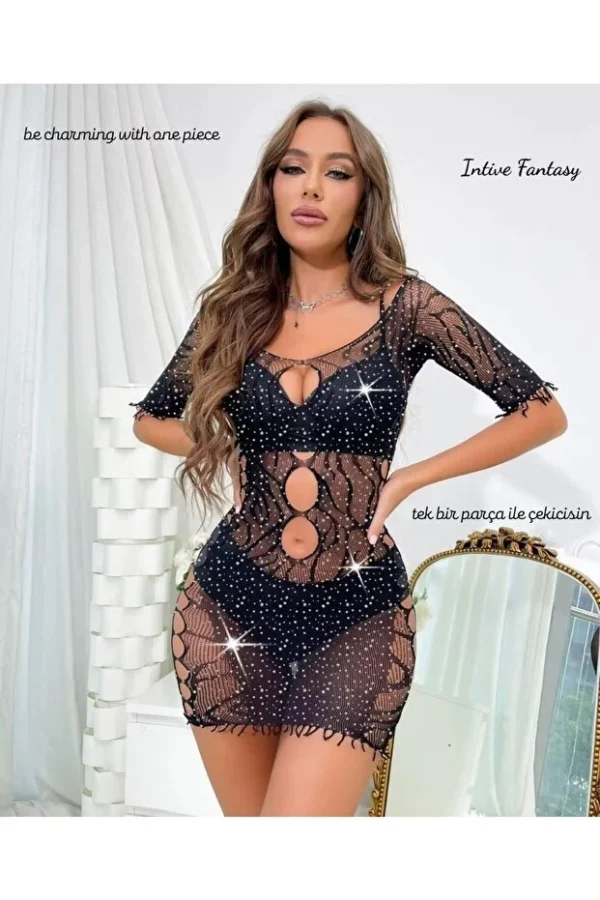 ✨ Ürün Özellikleri: Esnek ve vücuda tam oturan file kumaş Taşlı ve parlak detaylar Göğüs ve bel kısmında dekolte kesimler Yarım kollu şık tasarım Mini elbise formu