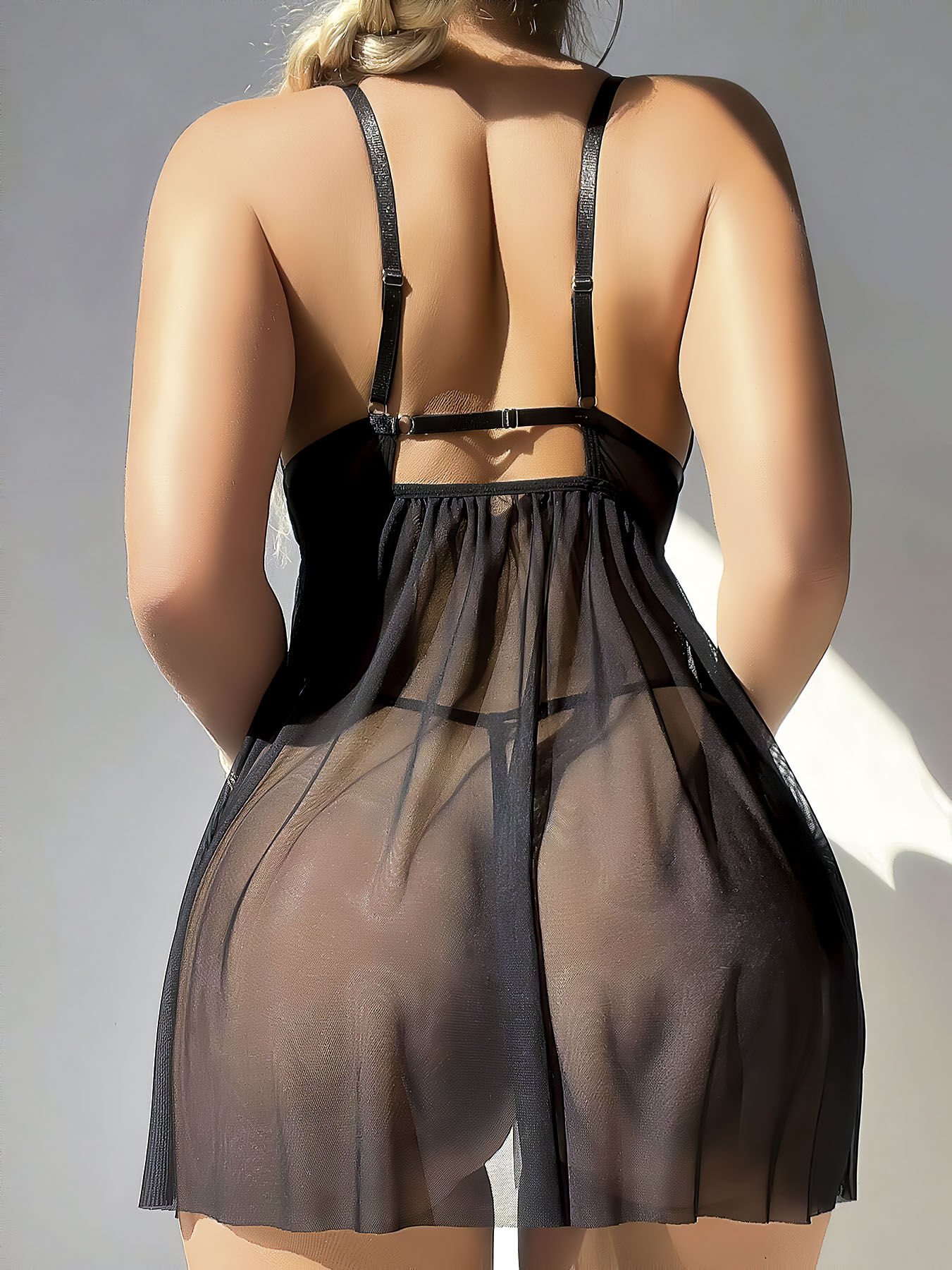 Göğüs kısmındaki dantel işlemeler ve zarif kesimi, ürüne romantik bir dokunuş katarken, ön kısmındaki açık tasarım modern ve çekici bir stil oluşturur. Esnek ve hafif kumaşı sayesinde gün boyu konfor sağlayan bu transparan tül gecelik, özel anlar ve romantik geceler için ideal bir tercihtir.